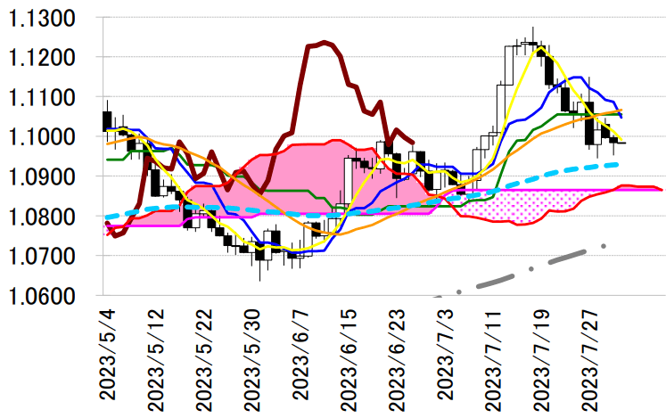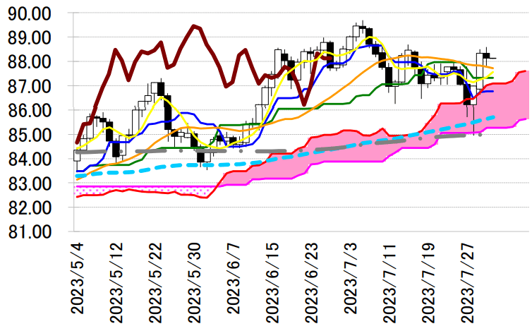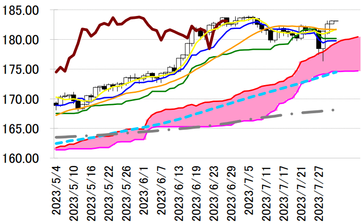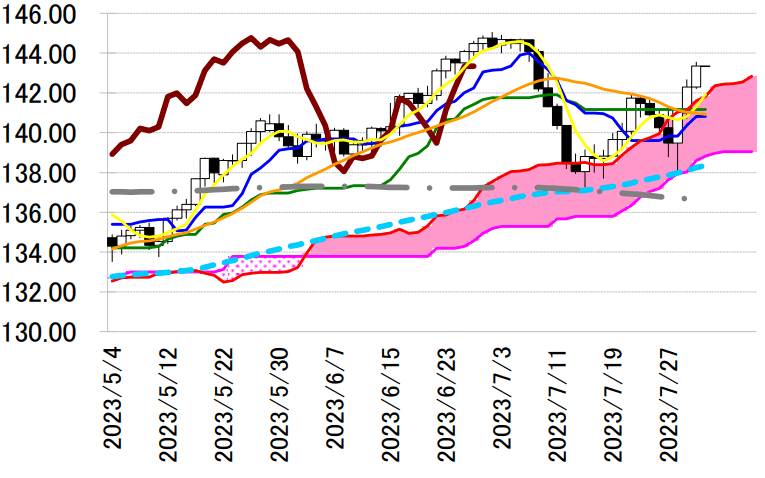 ドル円は、楽観的な米国経済の見通しを背景に、4 日に発表される米 7 月雇用統計に向けて、6 月 30 日の高値 145.07 円を目指す上昇トレンドを形成している。しかしながら、144 円台には、昨年 10 月 21 日の高値 151.95 円から今年 6 月の高値 145.07 円を経由する中期抵抗線が控えており、目先の抵抗帯(※ 本日は 144.15 円)となっている。さらに、145 円台では、本邦通貨当局がボラティリティー抑制という 名目でドル売り・円買い介入を行う可能性があり、植田日銀総裁も YCC の運用柔軟化の理由の一つに「為 替市場のボラティリティー抑制」を挙げていたことで、「8 月の円高アノマリー」を念頭に警戒しておき たい。
