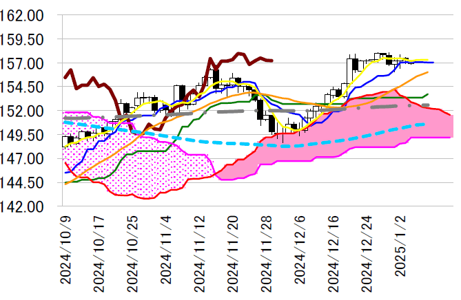 転換線は 157.05 円付近で横ばいであり、本日も同線を念