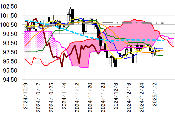 年末安値 96.94 円が支持帯として意識されるだろう。