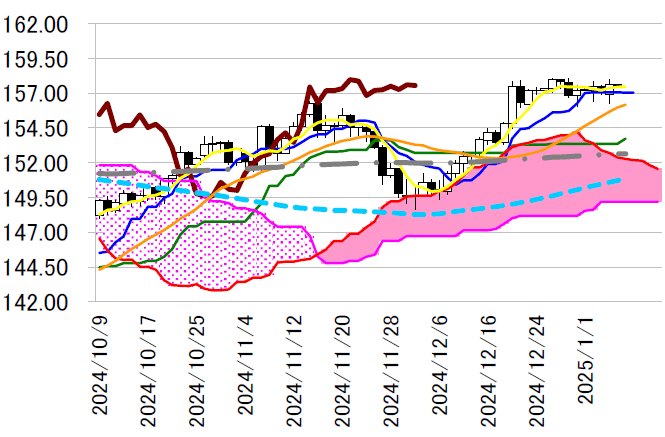 日足一目・転換線は157.05 円付近で横ばい。昨日は突き