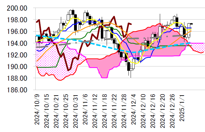 日足一目・転換線は196 円半ばで横ばいであり、昨日は上