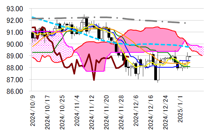 日足一目・転換線は88 円半ばで横ばいであり、目先の下