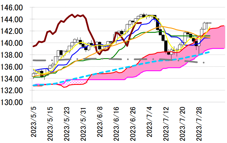 ドル円は 1 日に 143.55 円、昨日は 143.47 円まで上昇しており、明日発表される米 7 月雇用統計の結果 次第では、6 月 30 日の高値 145.07 円を上抜く可能性が高まっている。