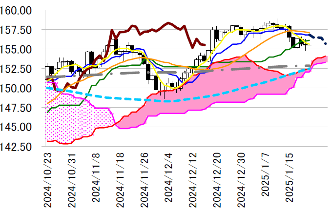 155 円半ばへ戻したが、156 円台で上昇傾向の一目均衡表・
