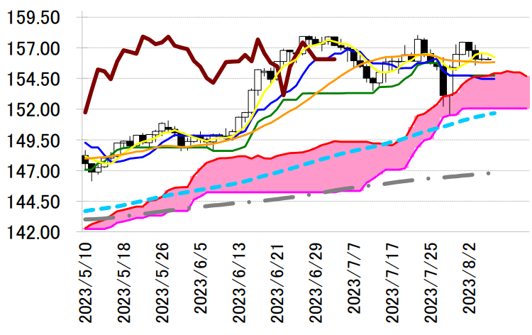 や 155 円半ばの 3 日安値が支持帯となるかを確かめたい。下