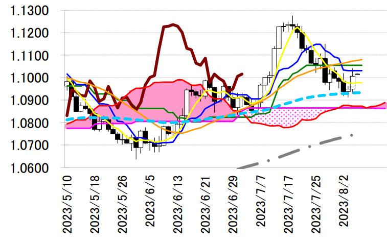 に。1.10 ドル半ばの基準線や 1.1070 ドル台の 21 日移動平均