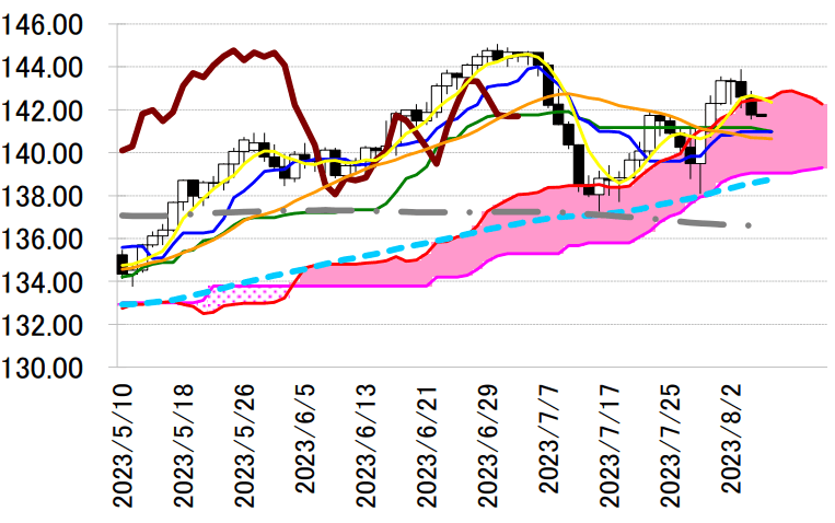 い。まずは基準線から 141 円割れの転換線が支持帯として働