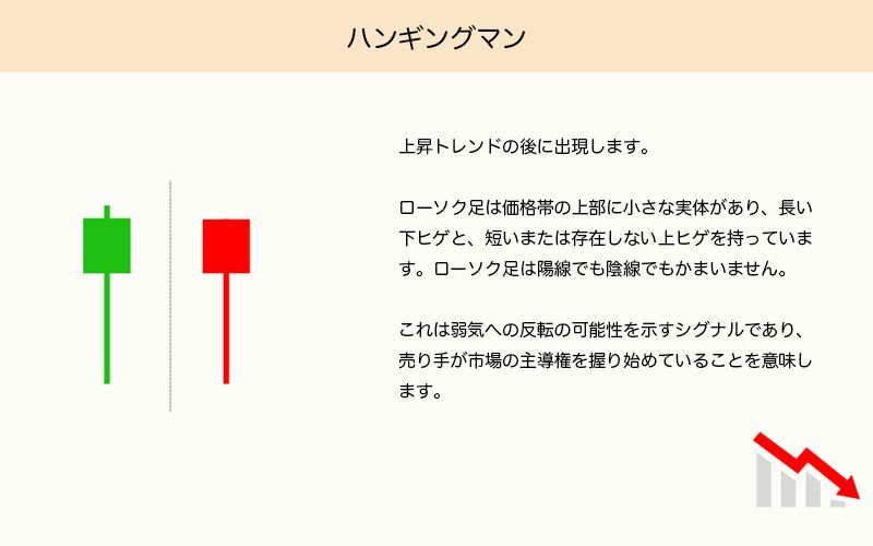 ハンギングマンは、価格が上昇した後の市場の迷いや不確実性を表しています。長い下ヒゲは、取引中に価格が一時的に下落したことを示し、終値が始値付近にあることから、買い手が上昇の勢いを維持できなかったことがわかります。