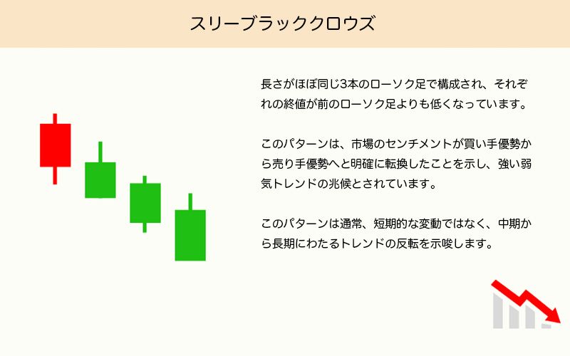 - 長さがほぼ同じ3本の陰線で構成され、それぞれの終値が前のローソク足よりも低い。
