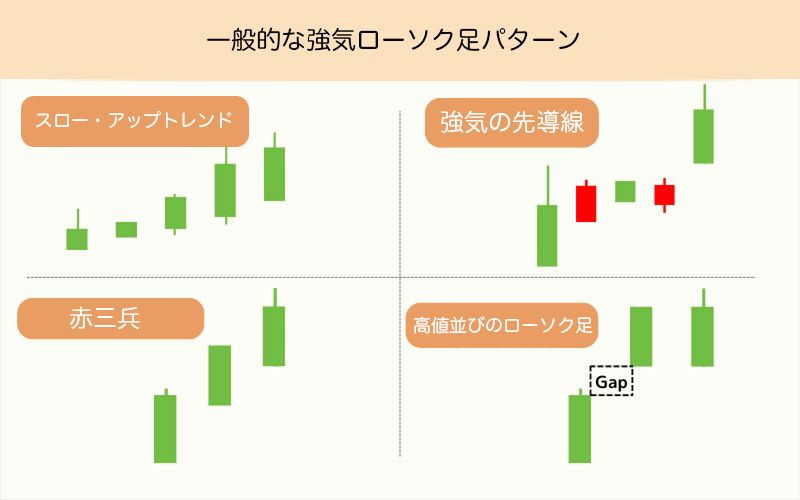 「スロー・アップトレンド」、「強気の先導線」、「スリー・ホワイト・ソルジャーズ」、「高値並びのローソク足」。