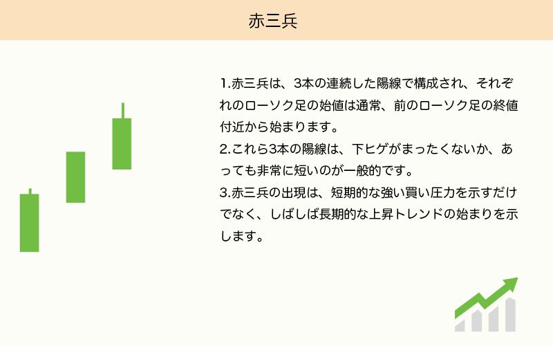 赤三兵の出現は、短期的な強気の勢いを示し、しばしば中長期的な上昇トレンドの始まりを意味します。