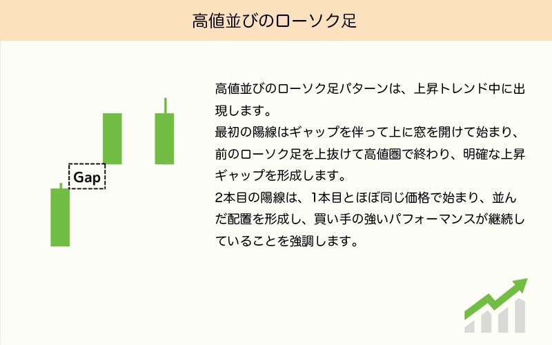 高値並びのローソク足パターンは、上昇トレンド中に現れる重要なシグナルで、2本以上の連続した陽線で構成されます。