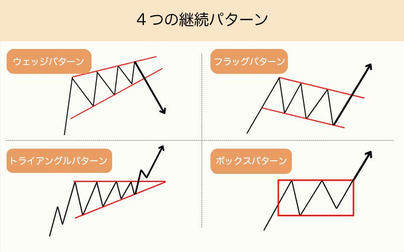ウェッジ、フラッグ、トライアングル、ボックスなどのパターンは、一般的にそれまでのトレンドが継続することを示唆します。