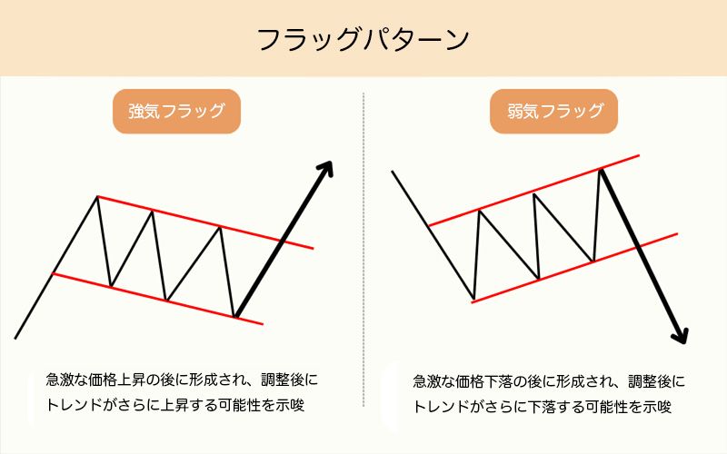 | フラッグ | 強いトレンドの後の小さな平行な価格の調整 | 継続 | フラッグポールとは逆方向のブレイクアウト |