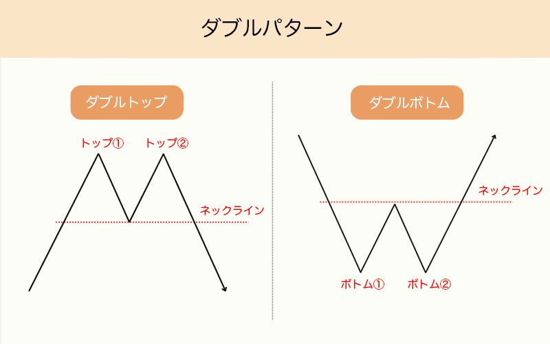 前述のとおり、ダブルトップでは2回目の下落がネックラインを下回ることでパターンが確認され、ダブルボトムでは2回目の上昇がネックラインを上回ることでパターンが確認されます。