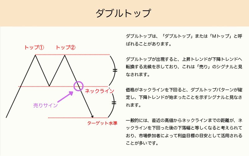 ダブルトップは、弱気の反転パターンで、2つのほぼ同じ高値が一度の明確な下落を挟んで現れる「M字型」の形を特徴とします。