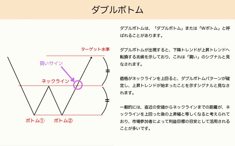 「ダブルボトム」や「Wボトム」とも呼ばれ、このパターンは売り手が一定の価格水準を維持できず、買い手が主導権を握ったことを示します。これは下降トレンドの終わりと上昇トレンドの始まりの可能性を示唆します。