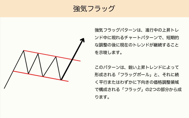 強気フラッグパターンは、進行中の上昇トレンド中に現れるチャートパターンで、短期的な調整の後に現在のトレンドが継続することを示唆します。