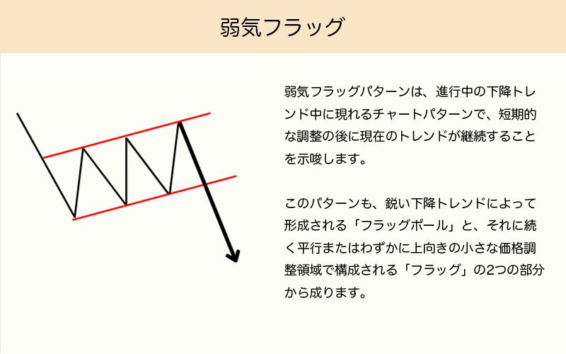 弱気フラッグパターンは、進行中の下降トレンド中に現れるチャートパターンで、短期的な調整の後に現在のトレンドが継続することを示唆します。