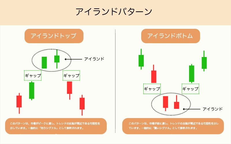 - アイランドリバーサルトップ:市場がピークに達し、トレンドの反転が差し迫っている可能性を示唆。一般的に「売りシグナル」と解釈されます。
