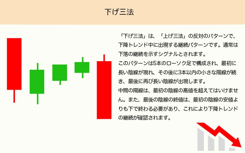 「下げ三法」は、「上げ三法」の反対パターンであり、下降トレンド中に出現する継続パターンです。通常は下落の継続を示すシグナルとされます。