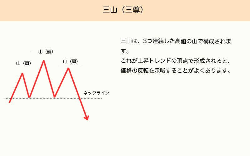 三山(三尊)は、3つ連続した価格の高値で構成され、上昇トレンドの頂点で形成されると、価格の反転を示唆します。