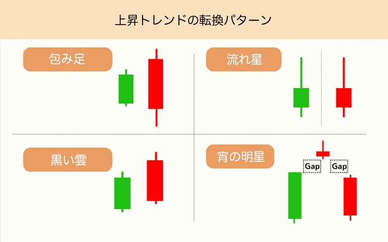 株式や為替などの金融市場において、「上昇トレンド転換のローソク足パターン」は、価格が下落する、または上昇トレンドが反転する兆候として重要な警告シグナルとなります。
