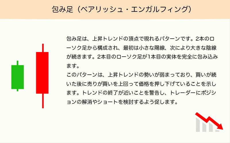 「包み足」は、上昇トレンドの頂点で現れます。2本のローソク足で構成され、最初の足は小さな陽線、次により大きな陰線が続きます。2本目のローソク足が1本目の実体を完全に包み込みます。