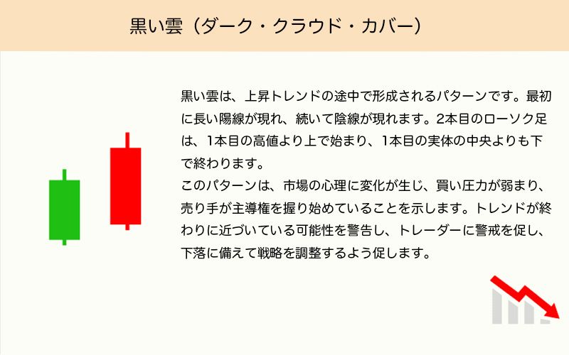 「黒い雲」は、上昇トレンド中に形成されます。最初は長い陽線、次に陰線が続きます。2本目のローソク足は、前の足の高値より上で始まり、実体の中央よりも下で終わります。