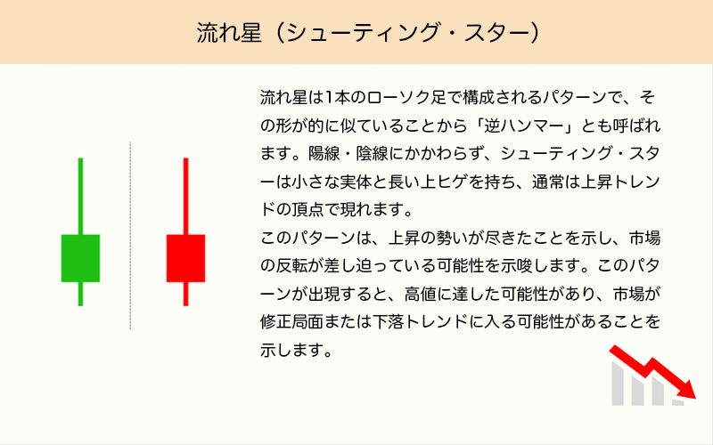 「流れ星」は、1本のローソク足で構成され、「逆ハンマー」とも呼ばれることがあります。これは的に似た形をしており、上昇トレンドの頂点で現れます。小さな実体と長い上ヒゲが特徴です。