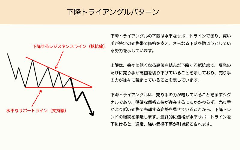 | 下降トライアングル | 水平サポートライン + 下降抵抗ライン | 下降トレンドの継続を示唆 | 下方へのブレイクアウト |