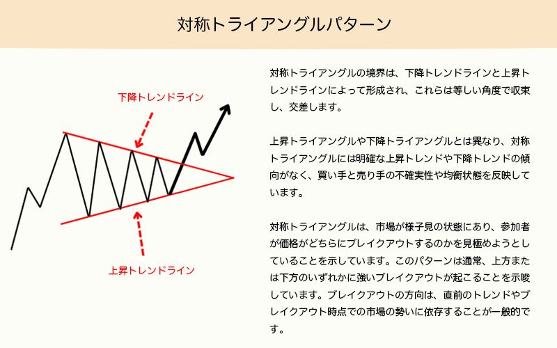 | 対称トライアングル | 下降トレンドライン + 上昇トレンドライン | 市場の方向不明・均衡状態 | いずれかの方向へのブレイクアウト |