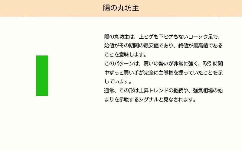 陽の丸坊主は、上ヒゲも下ヒゲもないローソク足で、始値が最安値、終値が最高値となるものです。このパターンは強い買い圧力を表しており、セッション全体を通して買い手が支配していたことを示します。上昇トレンドの継続や強気の始まりを示唆することがよくあります。