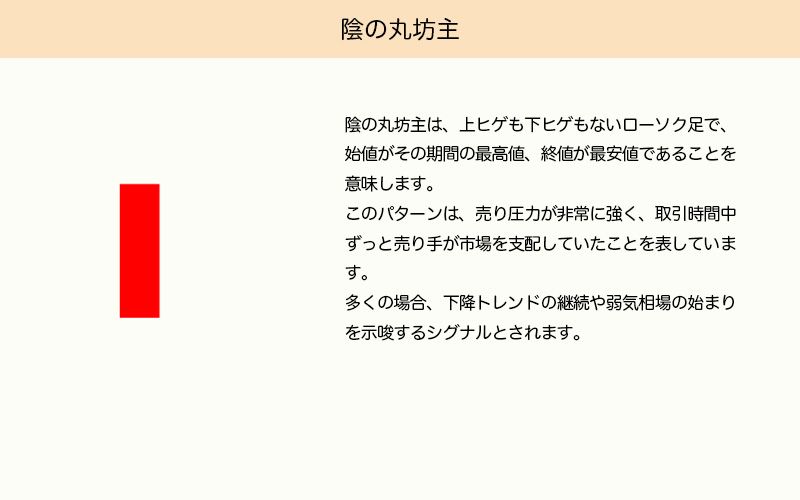 陰の丸坊主は、上ヒゲも下ヒゲもないローソク足で、始値が最高値、終値が最安値となるものです。このパターンは強い売り圧力を示しており、セッションを通じて売り手が市場を支配していたことを意味します。下降トレンドの継続や弱気の始まりを示すことがよくあります。