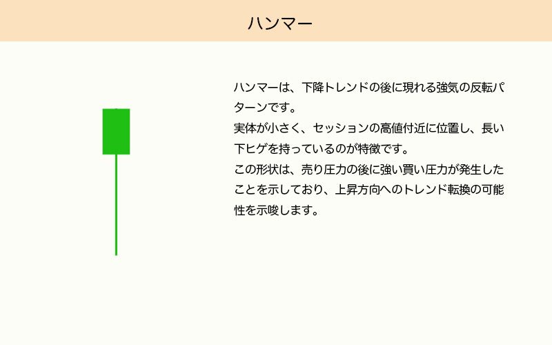 ハンマーは、下降トレンド後に出現する強気の反転パターンです。実体は小さくセッションの高値付近にあり、長い下ヒゲがあります。これは、売られた後に強い買い戻しがあったことを示しており、上昇へのトレンド反転の可能性を示唆します。
