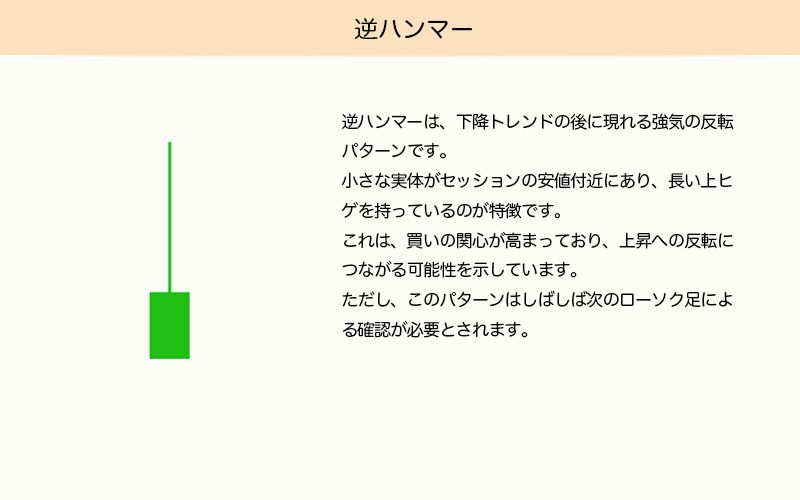 逆ハンマーは、下降トレンドの後に出現する強気の反転パターンです。実体はセッションの安値付近にあり、長い上ヒゲがあります。買い意欲の兆候が見られ、上昇への反転の可能性があります。ただし、次のローソク足による確認が必要とされることが多いです。
