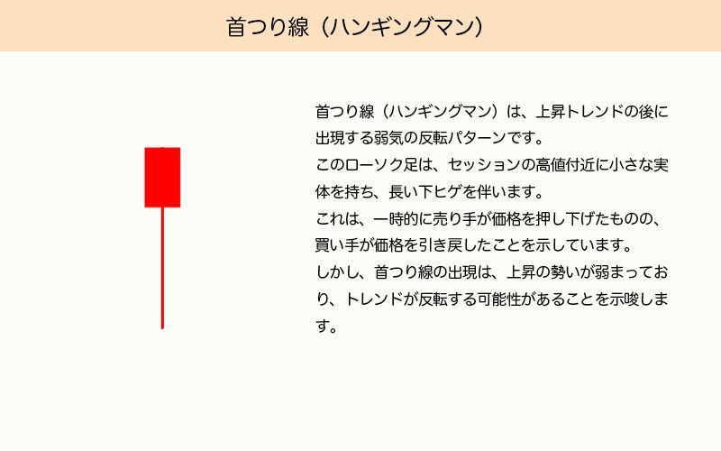 首吊り線は、上昇トレンド後に出現する弱気の反転パターンです。実体はセッションの高値付近にあり、長い下ヒゲを持ちます。売り手が価格を下げた後、買い手が押し戻したことを示しますが、上昇の勢いが弱まっていることを暗示します。