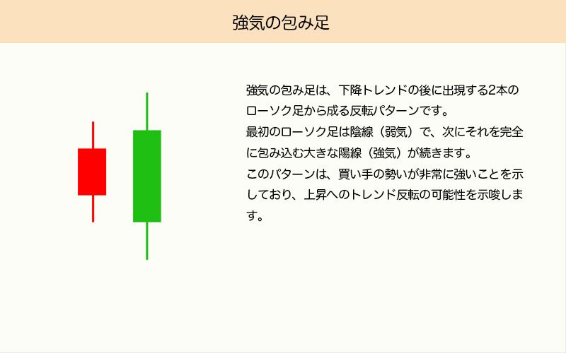 強気の包み足は、下降トレンド後に出現する2本のローソク足からなる反転パターンです。1本目は陰線で、2本目はそれを完全に包み込む大きな陽線となります。買い手の勢いが強く、上昇への反転を示します。