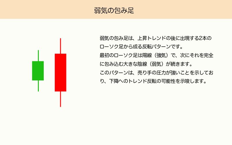 弱気の包み足は、上昇トレンド後に出現する2本のローソク足からなる反転パターンです。1本目は陽線で、2本目はそれを完全に包み込む大きな陰線となります。売り手の圧力が強く、下降への反転の可能性を示します。