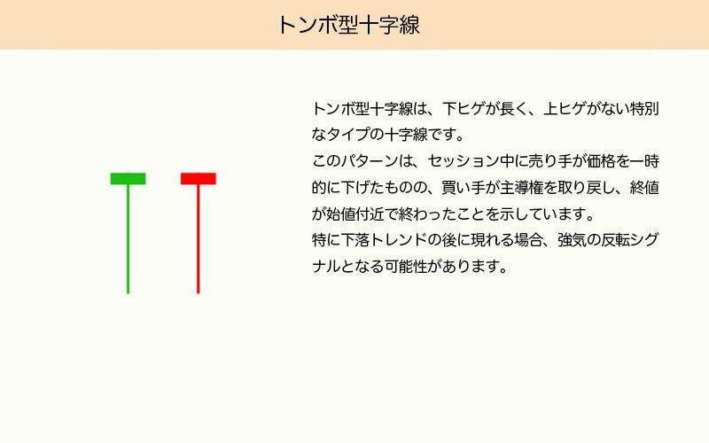 トンボ型十字線は、下ヒゲが長く、上ヒゲがない特別な十字線パターンです。売り手が一時的に価格を下げたものの、買い手が巻き返し、終値が始値付近で引けたことを示します。このパターンは、特に下落トレンドの後に強気への反転シグナルとなる可能性があります。