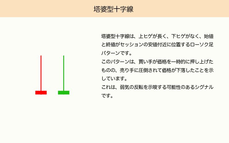 塔婆型十字線は、上ヒゲが長く、下ヒゲがなく、始値と終値がセッションの安値付近にあるローソク足パターンです。買い手が一時的に価格を上昇させたものの、最終的に売り手に押し戻されたことを示し、弱気反転のシグナルとなる可能性があります。