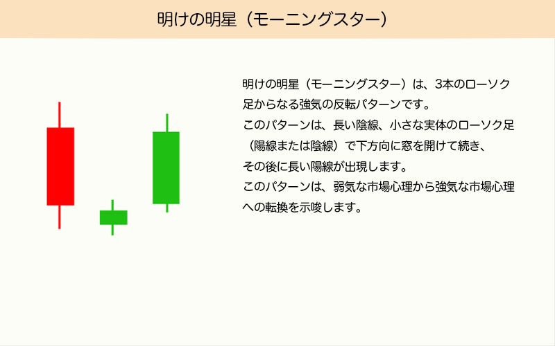 明けの明星は、3本のローソク足から構成される強気の反転パターンです。長い陰線、小さな実体(陽線または陰線)のローソク足(下にギャップして出現)、続いて長い陽線で構成され、市場心理が弱気から強気に転換することを示唆します。