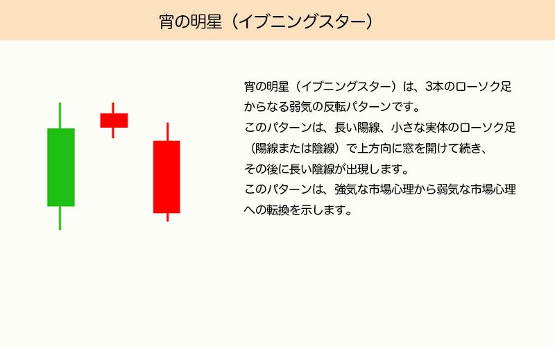 宵の明星は、3本のローソク足からなる弱気の反転パターンです。長い陽線、小さな実体のローソク足(上にギャップして出現)、そして長い陰線で構成され、強気から弱気への心理的転換を示します。