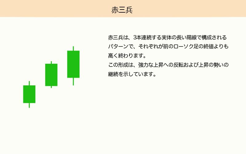 三兵パターンは、連続して出現する3本の長い陽線で構成され、それぞれが前のローソク足よりも高値で終わる形をとります。このフォーメーションは、強い上昇の反転と上昇の勢いの継続を示します。