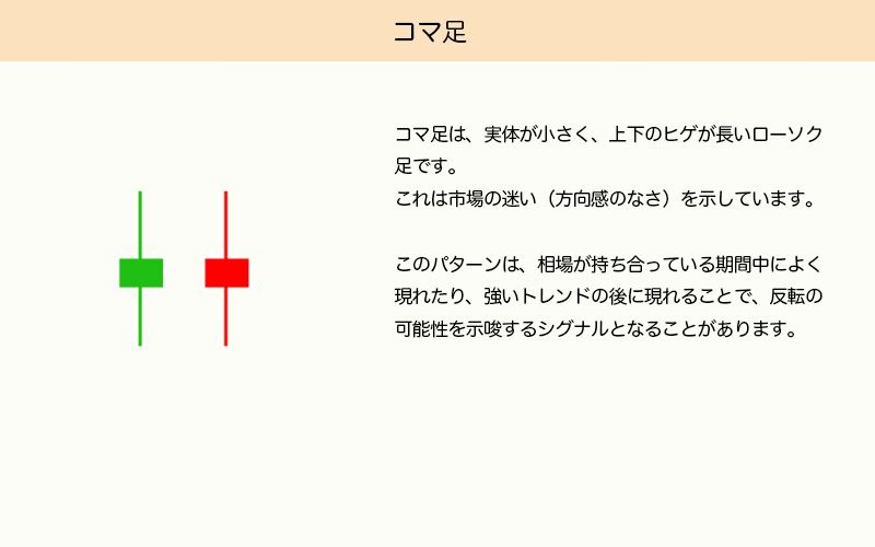 コマ足は、実体が小さく上下に長いヒゲを持つローソク足で、市場の迷いを示しています。強いトレンドの後に現れると、調整期間中や反転のシグナルとして機能することがあります。