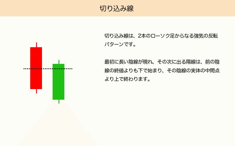 切り込み線は、2本のローソク足で構成される強気の反転パターンです。最初に長い陰線が現れ、その次に前の終値より下で始まり、陰線の実体の中間点を上回って終わる陽線が続きます。