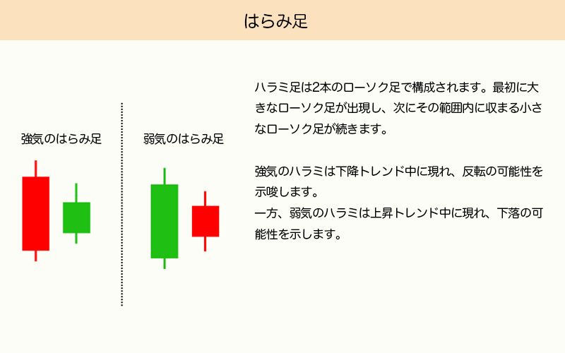 はらみ足パターンは、2本のローソク足で構成されます。最初に大きなローソク足が出現し、次にその実体の範囲内に収まる小さなローソク足が続きます。下降トレンド中に現れる強気のはらみは反転の兆候であり、上昇トレンド中に現れる弱気のはらみは下落の可能性を示唆します。