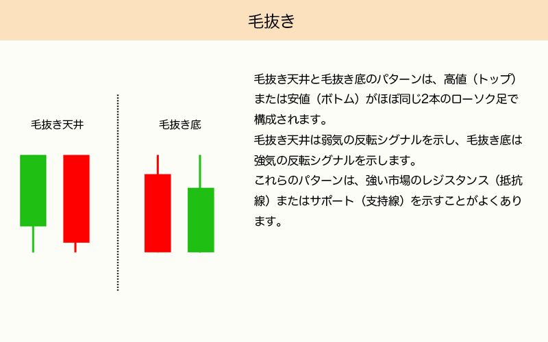 毛抜き天井および毛抜き底のパターンは、ほぼ同じ高値(トップ)または安値(ボトム)を持つ2本のローソク足で構成されます。毛抜き天井は弱気の反転シグナル、毛抜き底は強気の反転シグナルとして機能します。これらのパターンは、市場の強い抵抗線や支持線を示すことがよくあります。