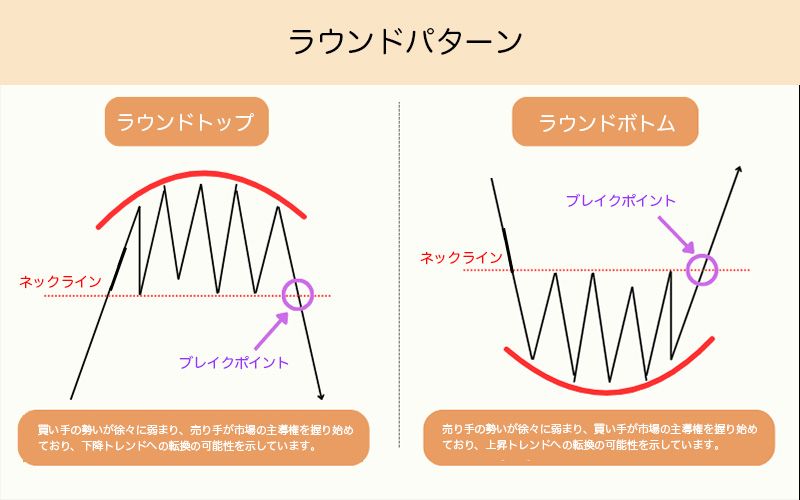 ラウンドパターン(ラウンドトップとラウンドボトム)は、市場でよく見られるもう一つのトレンド反転パターンで、価格がゆっくりと推移することで形成され、特定の価格帯で自然にトレンドが移行することを示します。