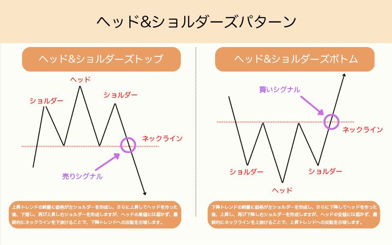 ヘッドアンドショルダーズパターン は、テクニカル分析における非常に有名なトレンド反転パターンで、相場の天井または底を見極めるために広く利用されます。